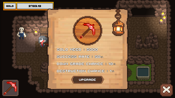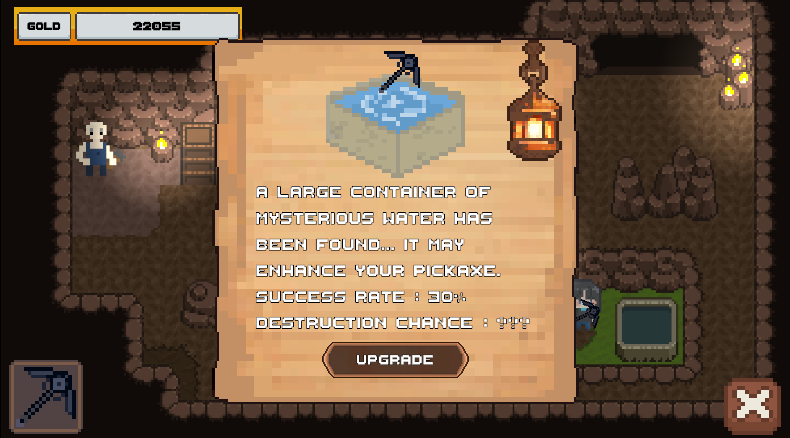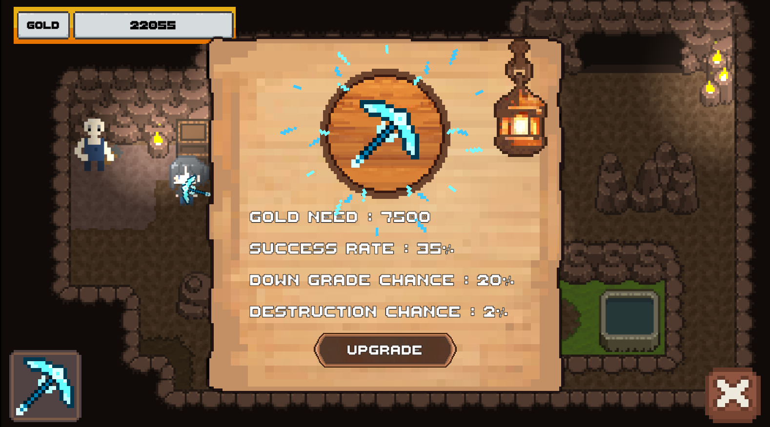 - Upgrade your pickaxe. Outcomes include Success, Fail, and keep, Fail with level down, and late-game Break. There is no safety net.